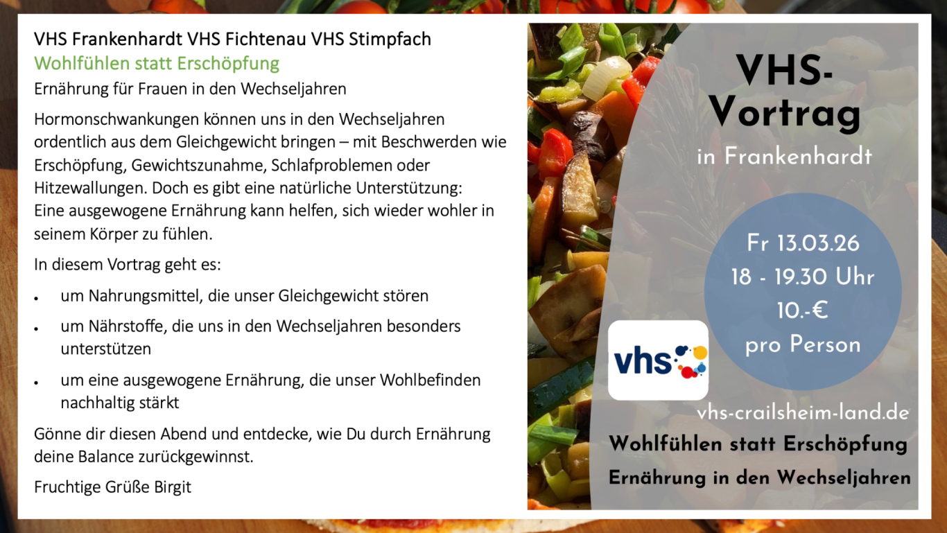 Bitte für diesen Kurs anmelden unter 07951 403-3800 oder www.vhs-crailsheim.de