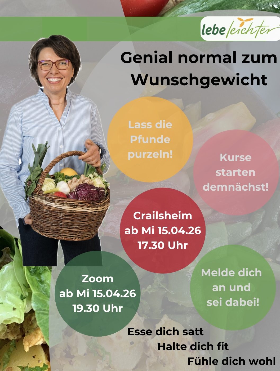 Hast du es satt, Kalorien zu zählen, auf erlaubtes und verbotenes Essen fixiert zu sein und von einer zur anderen Trenddiät zu wechseln? Mit dem Lebe leichter-Programm veränderst du dein Essverhalten. Nach Ostern, im April 2026 starten wieder neue Kurse.