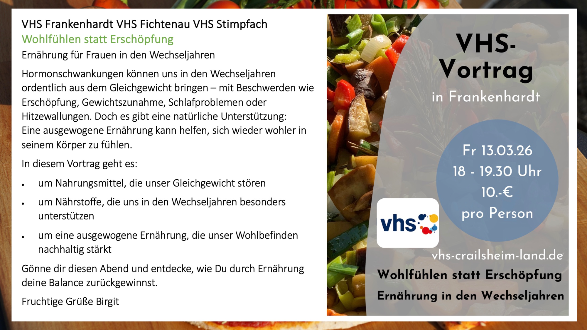 Bitte für diesen Kurs anmelden unter 07962 89212 oder vhs@fichtenau.de